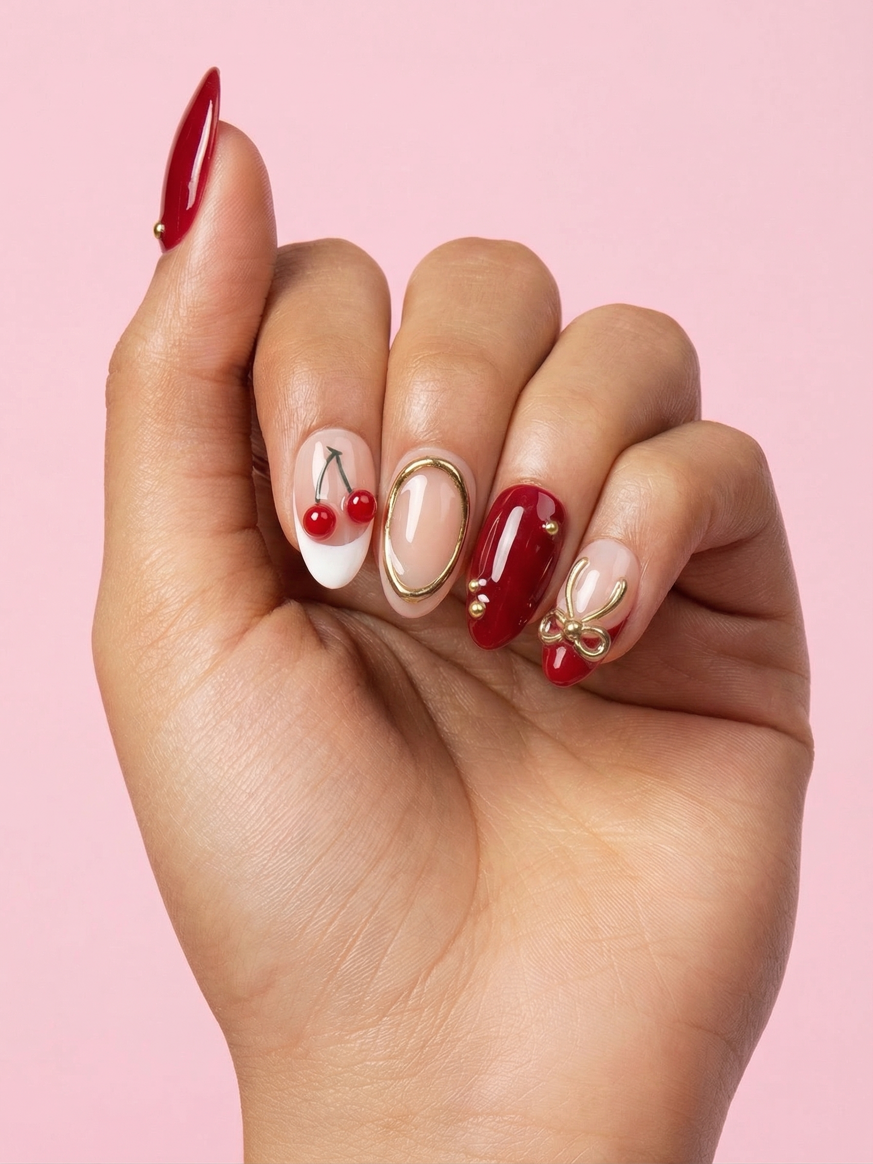 1 review for 3D Cherry & Gold Bow Deep Red Coquette Press On Nails